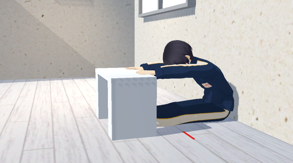 長座の姿勢:壁に背中とお尻をぴったりとつけて、肩幅の広さで両手のひらを下にして、手のひらの中央付近が測定器の手前端にかかるように置きます。また、胸を張って、両肘を伸ばしたまま測定器を手前に十分ひきつけ、背筋を伸ばします。