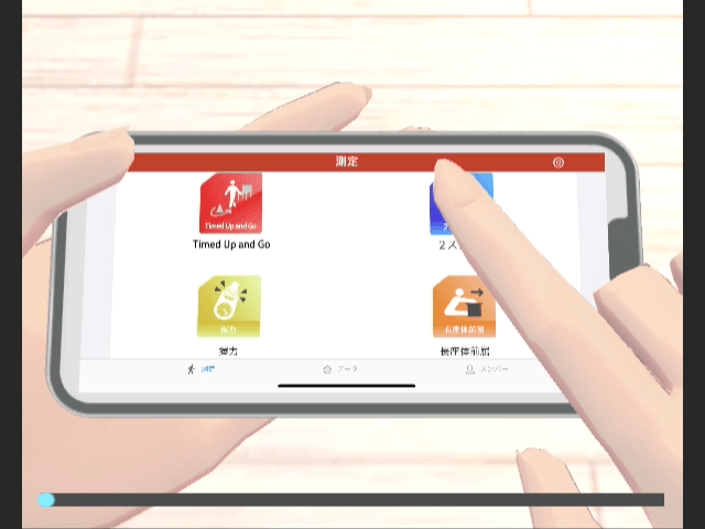 下肢の筋力・バランス能力・柔軟性などを含めた歩行能力を測定する種目です。